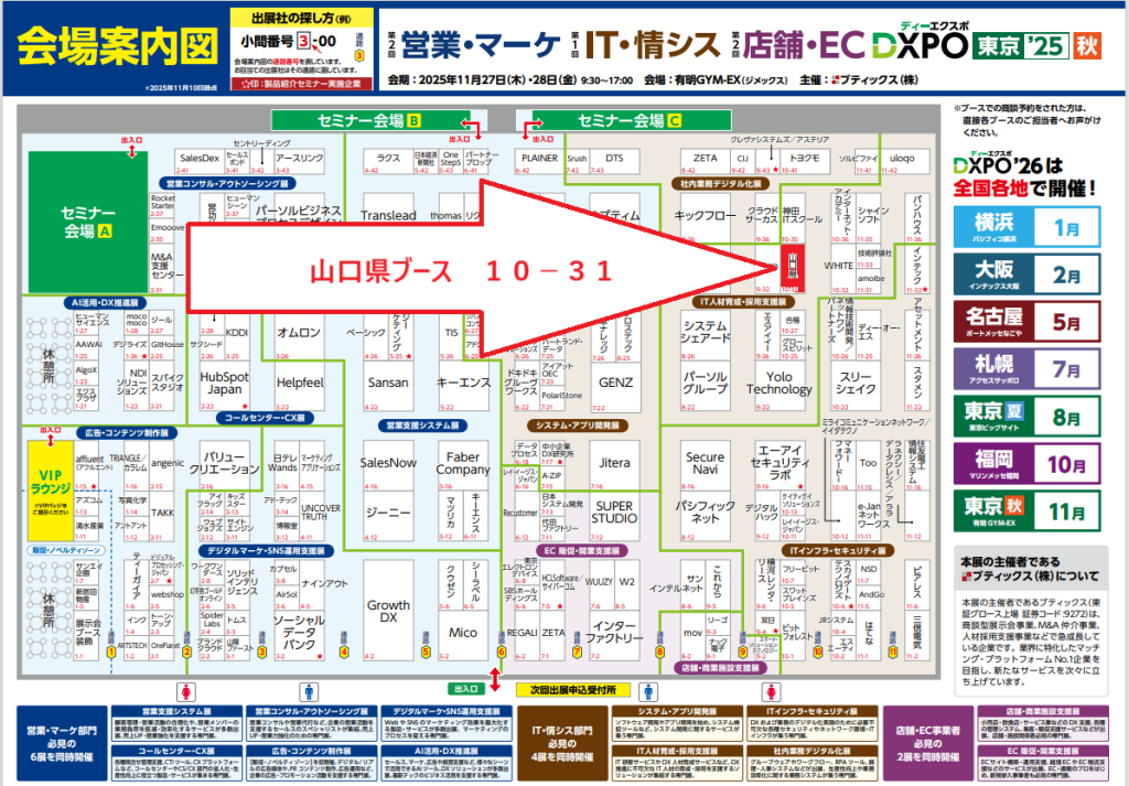 山口県は、2025年11月27日(木)から28日(金)の2日間、有明GYM-EX(ジメックス)にて開催される、システム開発・セキュリティ・IT人材育成 のための 展示会「IT・情シスDXPO東京’25【秋】」に出展いたします。