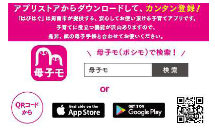 「はぴはぐ」は、周南市が提供する、安心してお使いいただける子育てアプリです。子育てに役立つ機能がたくさんありますので、紙の母子手帳と合わせてお使いください。